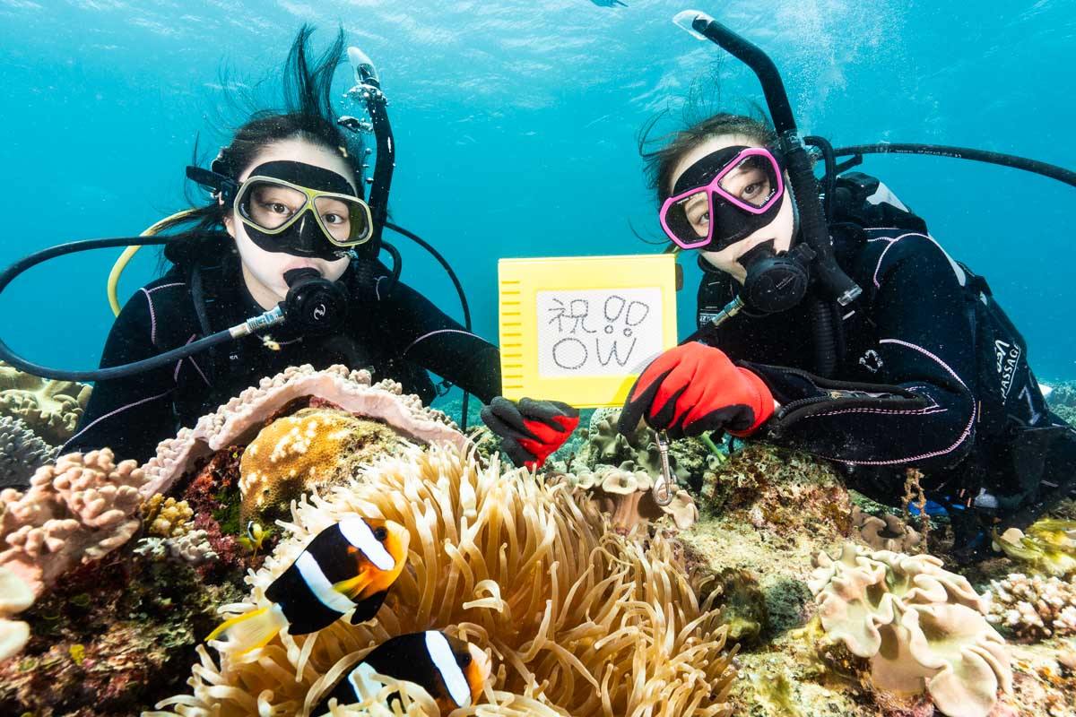 オープンウォーター取得は学科、限定水域での技能練習、海洋実習(通常3〜4ダイブ)を完了することで認定されます。