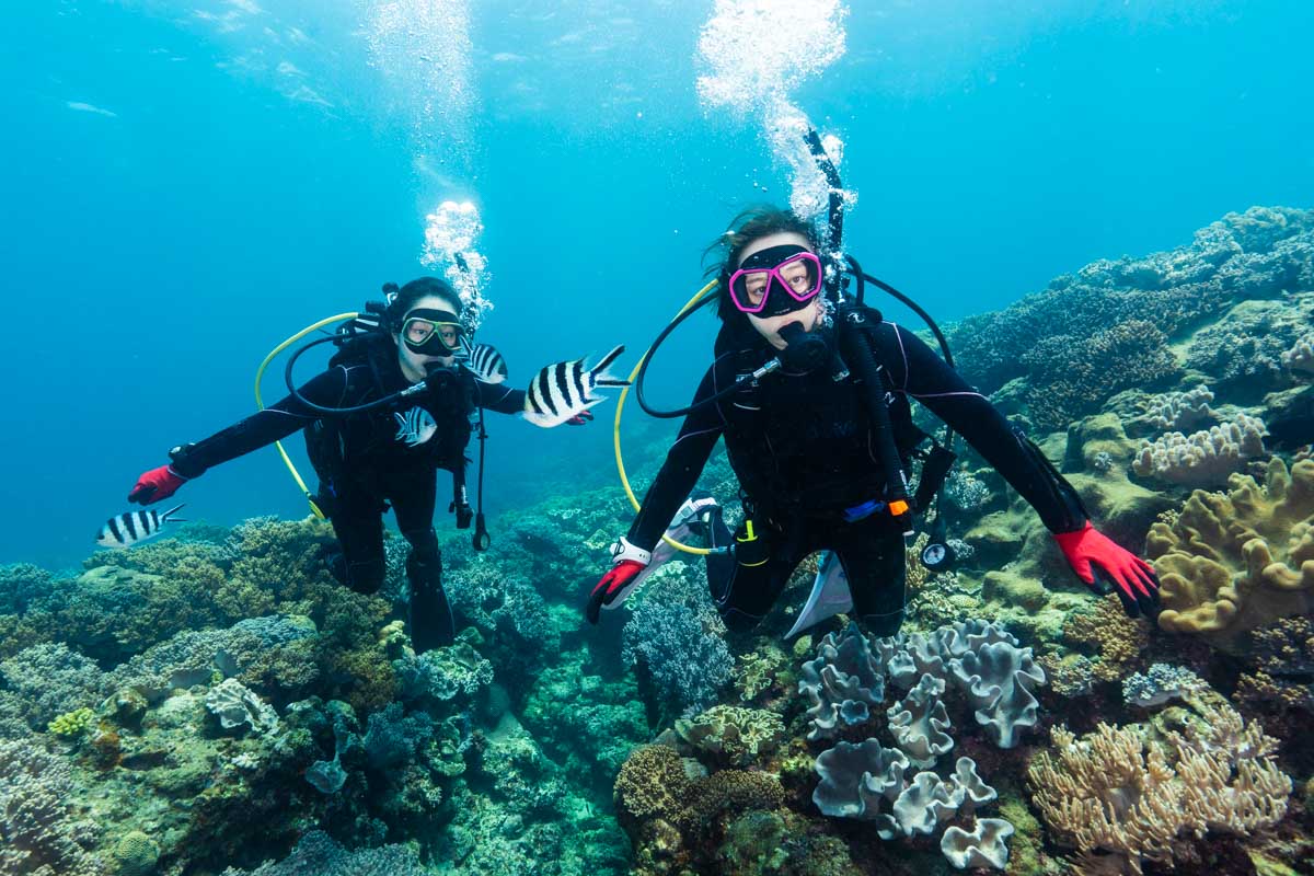 少人数だと器材装着の確認や水面でのスキル練習、海中でのアシストが丁寧に行え、初めての女性でも安心して実習に臨めます。
